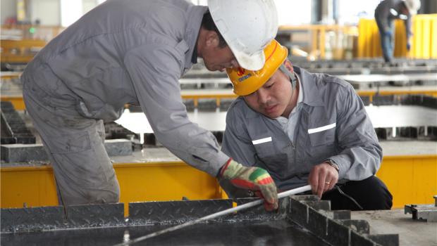 夏天的裝配式生產(chǎn)車間高溫難耐 ,生產(chǎn)經(jīng)理在和工人囑咐生產(chǎn)要點