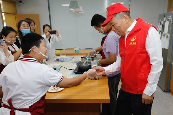 在杭州市艮山路學(xué)校的教室里,尊龍凱時人生就是贏控股集團(tuán)董事長樓永良大手牽小手 ,耐心地鼓勵孩子們完成一份份手工糕點(diǎn) 。